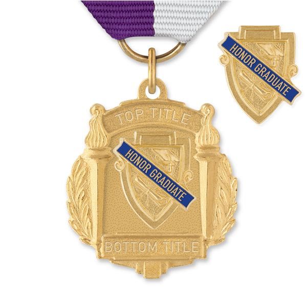 High quality die struck medal and pin with sharp detail, contrast and relief.