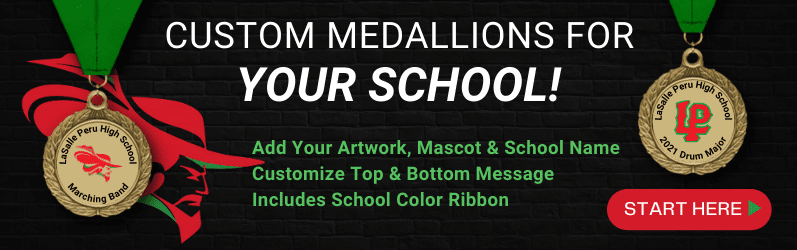 Shop our collection of customizable band awards: pins, medallions, medals, sculptures & more! Each piece is handcrafted in the USA, and can be customized to match your school band. Add a mascot or logo, choose for a large selection of achievement, match the ribbon to school colors, and so much more! All setup fees are FREE, we don't have any hidden fees.
